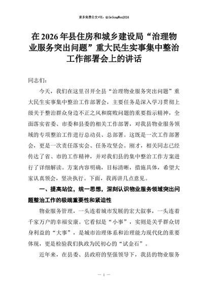 【七哥公文】2026年:在2026年县住房和城乡建设局“治理物业服务突出问题”重大民生实事集中整治工作部署会上的讲话+更多免费公文+VX:QiGeGongWen2024