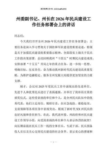 【七哥公文】2026年:州委副书记、州长在2026年民兵建设工作任务部署会上的讲话+更多免费公文+VX:QiGeGongWen2024
