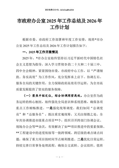 【七哥公文】2026年:市政府办公室2025年工作总结及2026年工作计划+更多免费公文+VX:QiGeGongWen2024