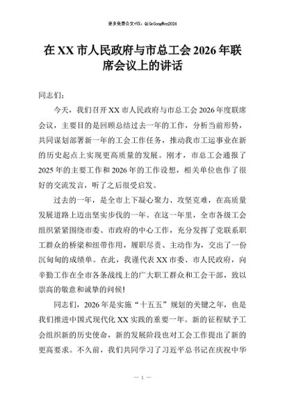 【七哥公文】2026年:在XX市人民政府与市总工会2026年联席会议上的讲话+更多免费公文+VX:QiGeGongWen2024