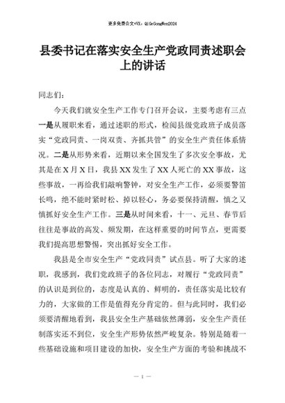 / 【七哥公文】2026年:县委书记在落实安全生产党政同责述职会上的讲话+更多免费公文+VX:QiGeGongWen2024