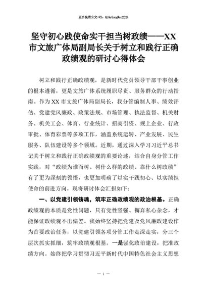 【七哥公文】2026年:坚守初心践使命实干担当树政绩——XX市文旅广体局副局长关于树立和践行正确政绩观的研讨心得体会+更多免费公文+VX:QiGeGongWen2024