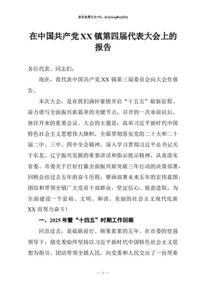 / 【七哥公文】2026年:在中国共产党XX镇第四届代表大会上的报告+更多免费公文+VX:QiGeGongWen2024