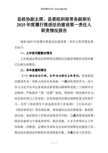 【七哥公文】2026年:县政协副主席、县委组织部常务副部长2025年度履行推进法治建设第一责任人职责情况报告+更多免费公文+VX:QiGeGongWen2024