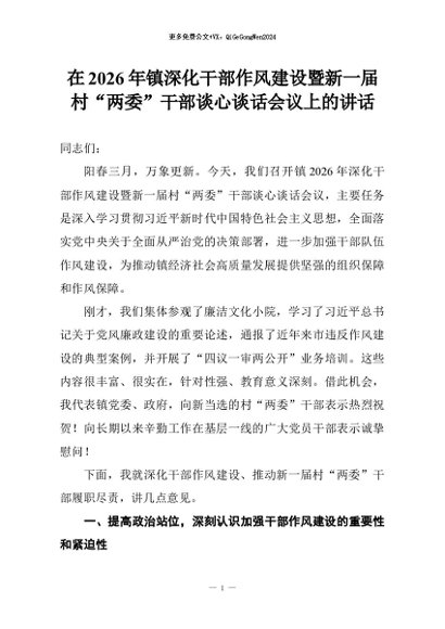 【七哥公文】2026年:在2026年镇深化干部作风建设暨新一届村“两委”干部谈心谈话会议上的讲话+更多免费公文+VX:QiGeGongWen2024