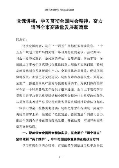 【七哥公文】2026年:党课讲稿:学习贯彻全国两会精神,奋力谱写全市高质量发展新篇章+更多免费公文+VX:QiGeGongWen2024