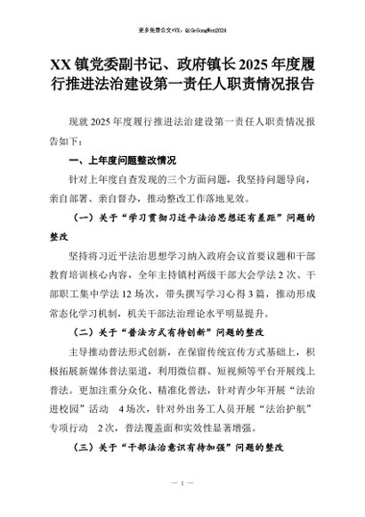 【七哥公文】2026年:XX镇党委副书记、政府镇长2025年度履行推进法治建设第一责任人职责情况报告+更多免费公文+VX:QiGeGongWen2024