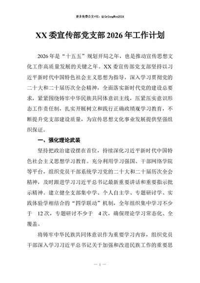/ 【七哥公文】2026年:XX委宣传部党支部2026年工作计划+更多免费公文+VX:QiGeGongWen2024