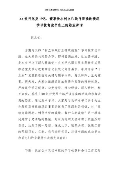 【七哥公文】2026年:XX银行党委书记、董事长在树立和践行正确政绩观学习教育读书班上的结业讲话3_副本+更多免费公文+VX:QiGeGongWen2024