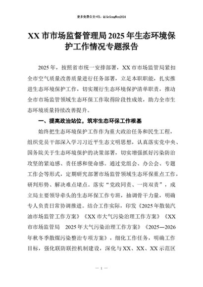 【七哥公文】2026年:XX市市场监督管理局2025年生态环境保护工作情况专题报告+更多免费公文+VX:QiGeGongWen2024