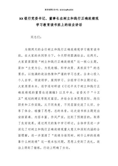 【七哥公文】2026年:XX银行党委书记、董事长在树立和践行正确政绩观学习教育读书班上的结业讲话_副本+更多免费公文+VX:QiGeGongWen2024