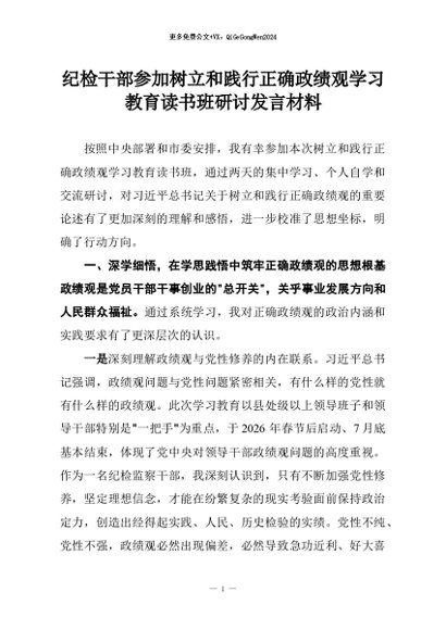 【七哥公文】2026年:纪检干部参加树立和践行正确政绩观学习教育读书班研讨发言材料+更多免费公文+VX:QiGeGongWen2024