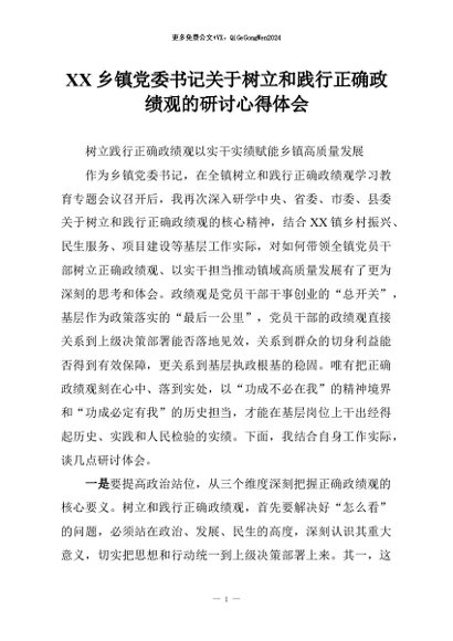 【七哥公文】2026年:XX乡镇党委书记关于树立和践行正确政绩观的研讨心得体会+更多免费公文+VX:QiGeGongWen2024