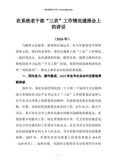 / 【七哥公文】2026年:在系统老干部“三农”工作情况通报会上的讲话+更多免费公文+VX:QiGeGongWen2024