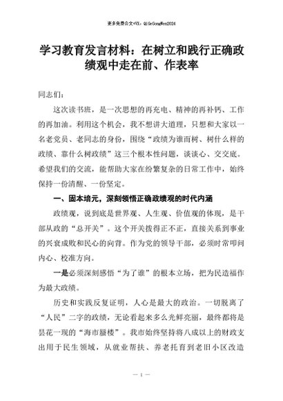 【七哥公文】2026年:学习教育发言材料:在树立和践行正确政绩观中走在前、作表率+更多免费公文+VX:QiGeGongWen2024