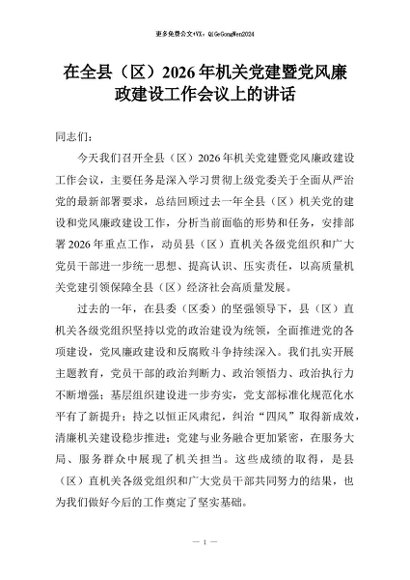 【七哥公文】2026年:在全县(区)2026年机关党建暨党风廉政建设工作会议上的讲话+更多免费公文+VX:QiGeGongWen2024