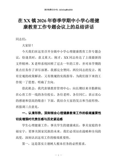 【七哥公文】2026年:在XX镇2026年春季学期中小学心理健康教育工作专题会议上的总结讲话+更多免费公文+VX:QiGeGongWen2024