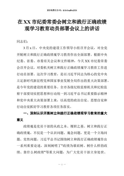 【七哥公文】2026年:在XX市纪委常委会树立和践行正确政绩观学习教育动员部署会议上的讲话+更多免费公文+VX:QiGeGongWen2024
