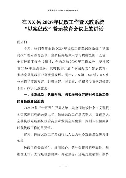 【七哥公文】2026年:在XX县2026年民政工作暨民政系统“以案促改”警示教育会议上的讲话+更多免费公文+VX:QiGeGongWen2024