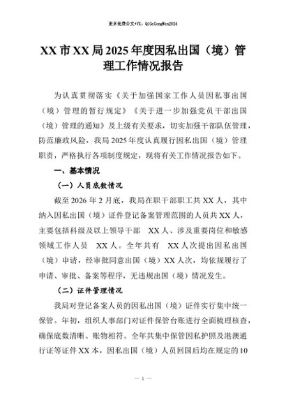 【七哥公文】2026年:XX市XX局2025年度因私出国(境)管理工作情况报告+更多免费公文+VX:QiGeGongWen2024