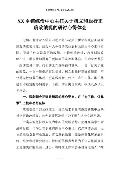 【七哥公文】2026年:XX乡镇综治中心主任关于树立和践行正确政绩观的研讨心得体会+更多免费公文+VX:QiGeGongWen2024