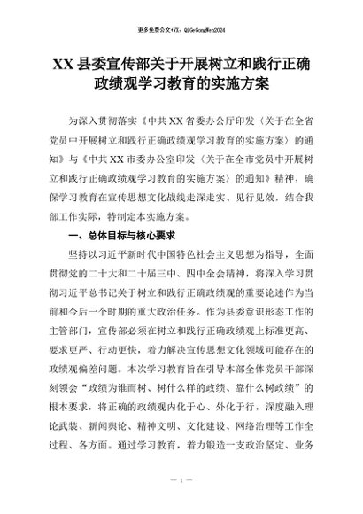 【七哥公文】2026年:XX县委宣传部关于开展树立和践行正确政绩观学习教育的实施方案+更多免费公文+VX:QiGeGongWen2024