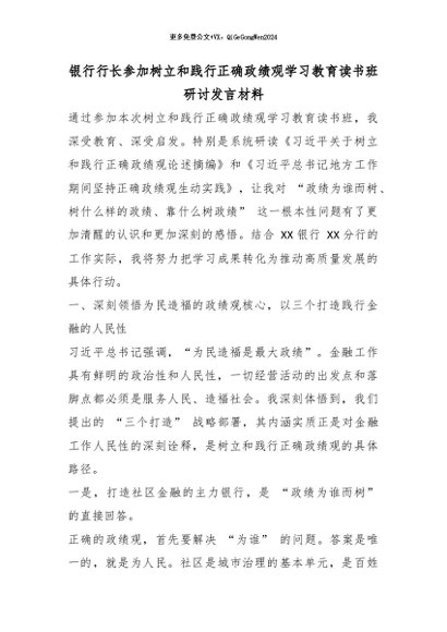 【七哥公文】2026年:银行行长参加树立和践行正确政绩观学习教育读书班研讨发言材料_副本+更多免费公文+VX:QiGeGongWen2024