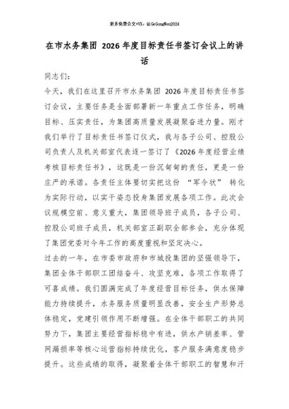 【七哥公文】2026年:在市水务集团 2026 年度目标责任书签订会议上的讲话_副本+更多免费公文+VX:QiGeGongWen2024