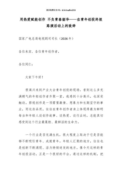 【七哥公文】2026年:用热爱赋能创作 不负青春韶华——在青年创投终极路演活动上的致辞_副本+更多免费公文+VX:QiGeGongWen2024