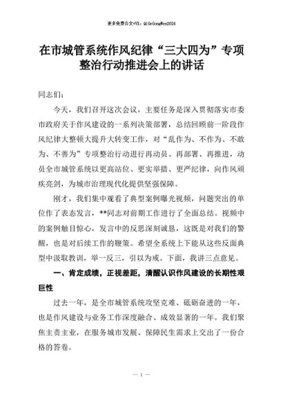 【七哥公文】2026年:在市城管系统作风纪律“三大四为”专项整治行动推进会上的讲话+更多免费公文+VX:QiGeGongWen2024