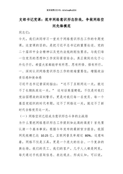 【七哥公文】2026年:支部书记党课:筑牢网络意识形态防线,争做网络空间先锋模范_副本+更多免费公文+VX:QiGeGongWen2024