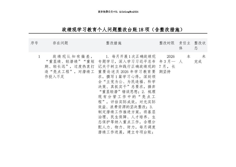 【七哥公文】2026年:政绩观学习教育个人问题整改台账18项(含整改措施)_副本+更多免费公文+VX:QiGeGongWen2024