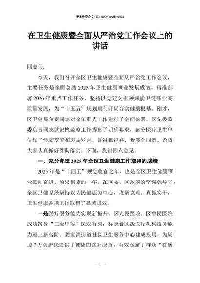 / 【七哥公文】2026年:在卫生健康暨全面从严治党工作会议上的讲话+更多免费公文+VX:QiGeGongWen2024