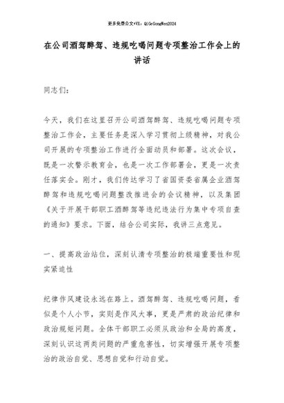 【七哥公文】2026年:在公司酒驾醉驾、违规吃喝问题专项整治工作会上的讲话_副本+更多免费公文+VX:QiGeGongWen2024