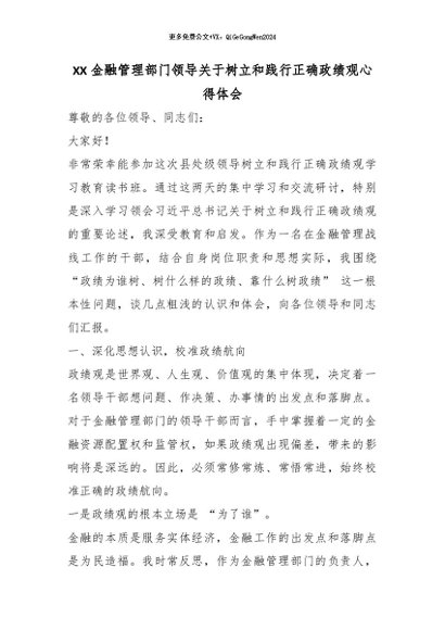 【七哥公文】2026年:XX 金融管理部门领导关于树立和践行正确政绩观心得体会_副本+更多免费公文+VX:QiGeGongWen2024