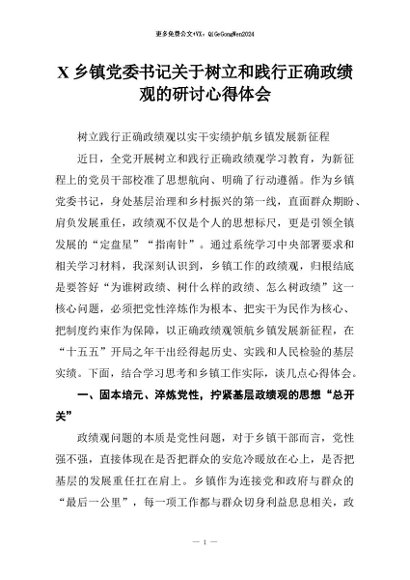 【七哥公文】2026年:X乡镇党委书记关于树立和践行正确政绩观的研讨心得体会+更多免费公文+VX:QiGeGongWen2024