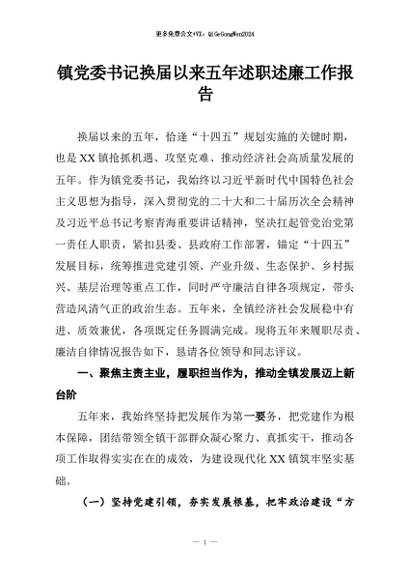 【七哥公文】2026年:镇党委书记换届以来五年述职述廉工作报告+更多免费公文+VX:QiGeGongWen2024