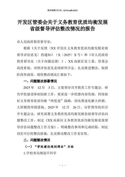 【七哥公文】2026年:开发区管委会关于义务教育优质均衡发展省级督导评估整改情况的报告+更多免费公文+VX:QiGeGongWen2024