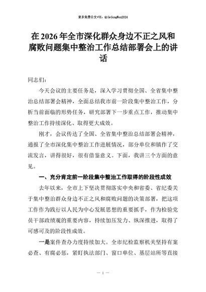 【七哥公文】2026年:在2026年全市深化群众身边不正之风和腐败问题集中整治工作总结部署会上的讲话+更多免费公文+VX:QiGeGongWen2024