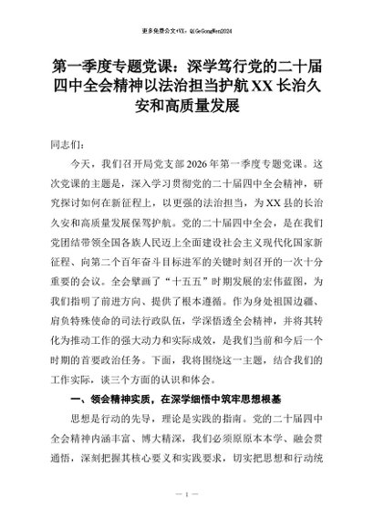 【七哥公文】2026年:第一季度专题党课:深学笃行党的二十届四中全会精神以法治担当护航XX长治久安和高质量发展+更多免费公文+VX:QiGeGongWen2024