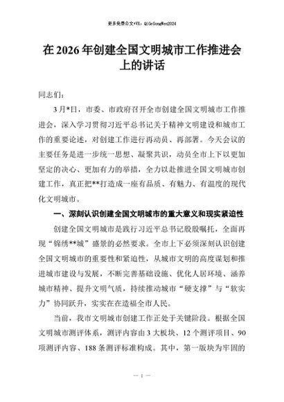 / 【七哥公文】2026年:在2026年创建全国文明城市工作推进会上的讲话+更多免费公文+VX:QiGeGongWen2024