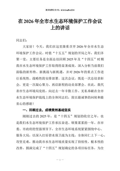 / 【七哥公文】2026年:在2026年全市水生态环境保护工作会议上的讲话+更多免费公文+VX:QiGeGongWen2024