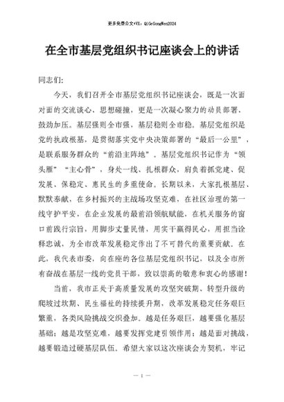 / 【七哥公文】2026年:在全市基层党组织书记座谈会上的讲话+更多免费公文+VX:QiGeGongWen2024