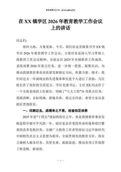 / 【七哥公文】2026年:在XX镇学区2026年教育教学工作会议上的讲话+更多免费公文+VX:QiGeGongWen2024