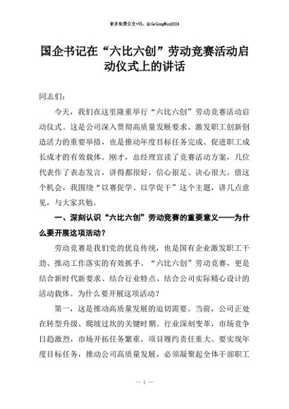 【七哥公文】2026年:国企书记在“六比六创”劳动竞赛活动启动仪式上的讲话+更多免费公文+VX:QiGeGongWen2024