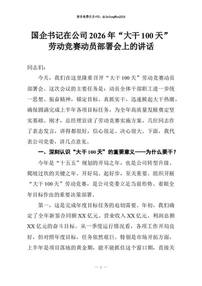 【七哥公文】2026年:国企书记在公司2026年“大干100天”劳动竞赛动员部署会上的讲话+更多免费公文+VX:QiGeGongWen2024