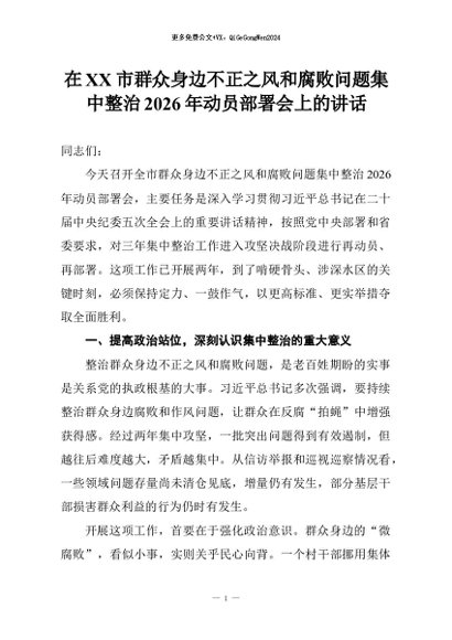 【七哥公文】2026年:在XX市群众身边不正之风和腐败问题集中整治2026年动员部署会上的讲话+更多免费公文+VX:QiGeGongWen2024