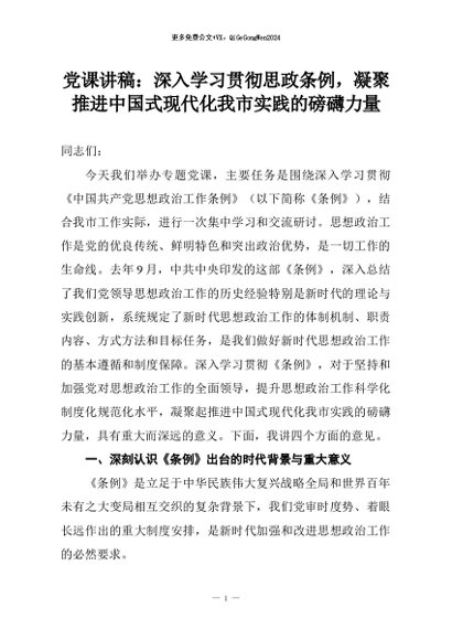 【七哥公文】2026年:党课讲稿:深入学习贯彻思政条例,凝聚推进中国式现代化我市实践的磅礴力量+更多免费公文+VX:QiGeGongWen2024