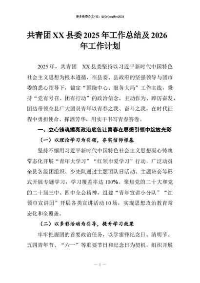 【七哥公文】2026年:共青团XX县委2025年工作总结及2026 年工作计划+更多免费公文+VX:QiGeGongWen2024