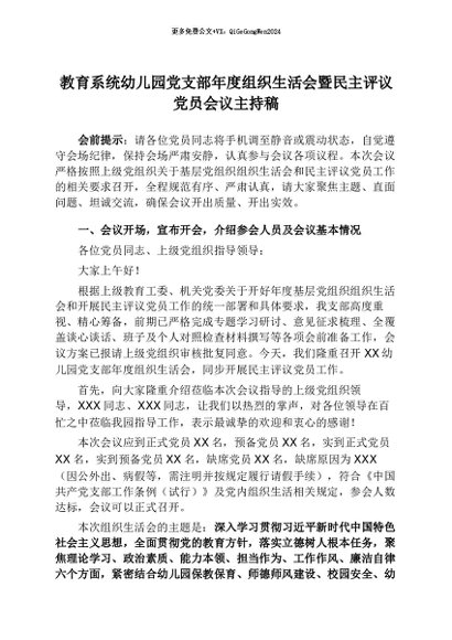 【七哥公文】2026年:教育系统幼儿园党支部年度组织生活会暨民主评议党员会议主持稿+更多免费公文+VX:QiGeGongWen2024
